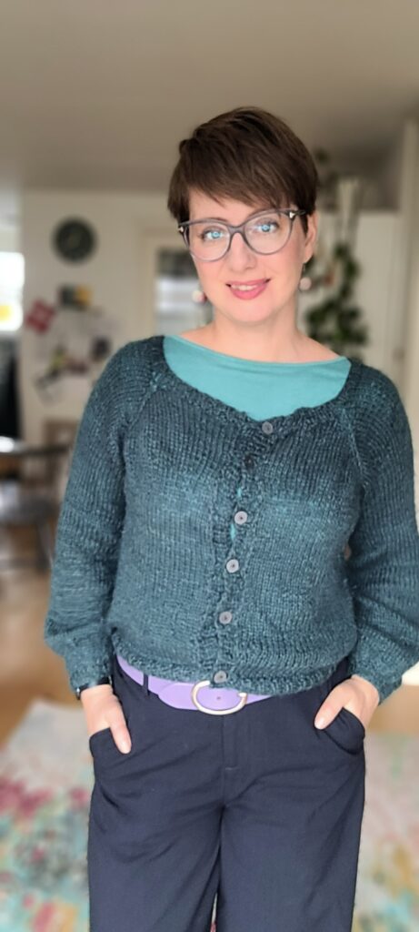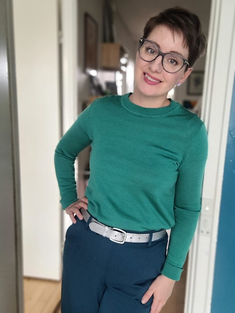 Første billede: Den smaragdgrønne sweater i merino er fra GAP og den er en af de første ting jeg købte, efter at jeg begyndte at gå målrettet efter de farver, der klæder mig bedst. Her er den i en for mig helt ny kombination med de petroleumsfarvede bukser fra Object og et sølvfarvet bælte.