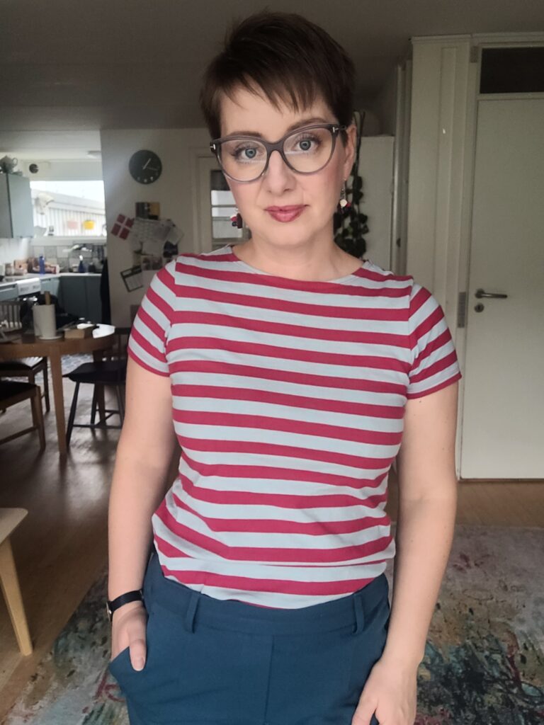 Andet billede: Et simpelt hverdagsoutfit med mine petroleumsfarvede bukser, her sat sammen med den stribede t-shirt i kirsebærrød og lys turkis. Måske kan du skimte at samme røde går igen i mine øreringe? Jeg går også altid med rød læbefarve til denne t-shirt – her har jeg valgt Burt’s Bees Lip Shimmer i farven Rhubarb. Det er en skøn farve som altid giver glød til min hudtone og øjne.