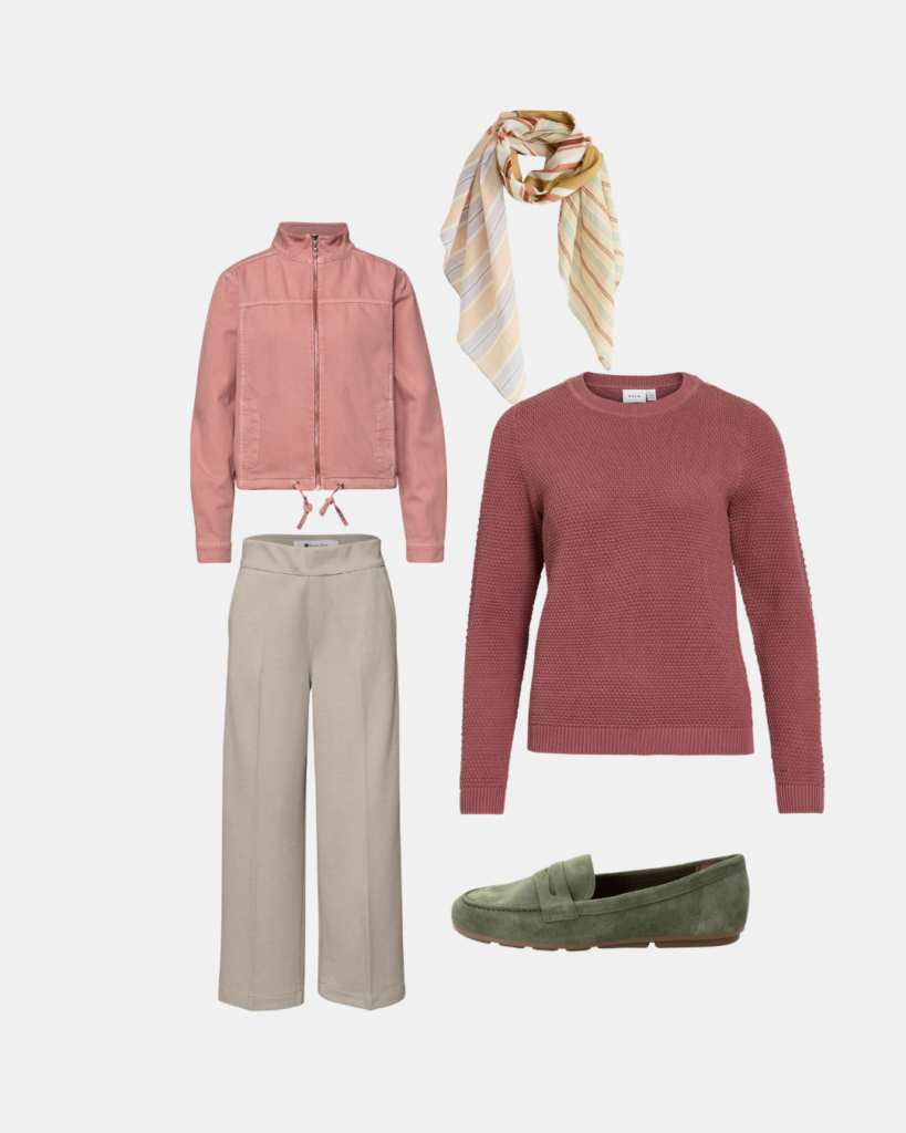 I dette forårsoutfit bevæger vi os over i de lidt lysere nuancer i paletten med grå beige, sand, rustrosa og støvet rosa. Outfittet bindes sammen af de brændte rosa toner og de olivengrønne loafers giver visuel vægt og harmoni med de grå bukser.