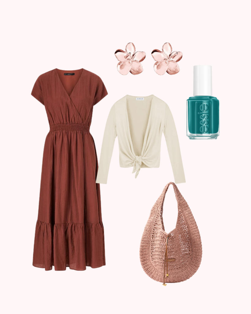 Kjolens rustrøde farve giver den dybde, en Soft Autumn har brug for – uden at være overvældende – mens den lyse cardigan og taske gør hele outfittet lysere og lettere. De rosagyldne øreringe giver glød uden at outshine Soft Autumn udseendet.