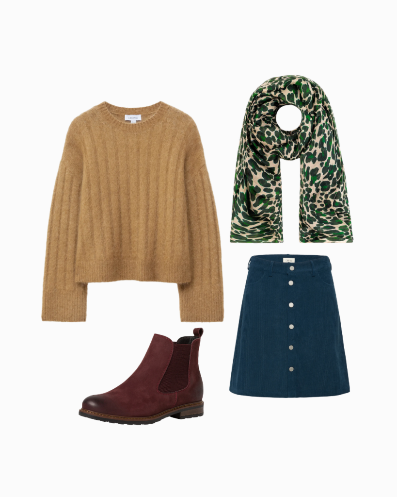Hvis du, ligesom her, har valgt en trøje i en mere neutral farve, er et tørklæde i en mere markant farve særligt godt til at undgå at hele dit look flyder sammen i beige. De varme toner i trøjen og tørklædet går godt i spænd med de dybe toner i nederdelen og støvlerne – hele dette look har en varm, dæmpet og lidt dyb undertone.