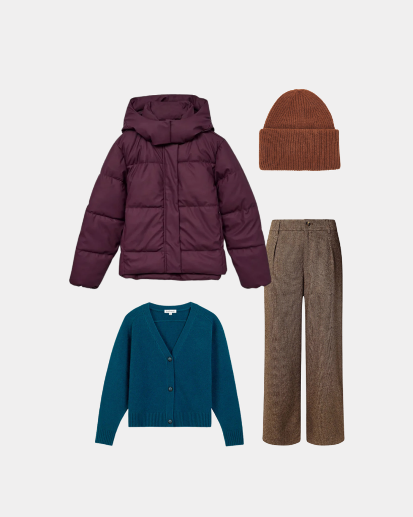 Her har jeg valgt en vinterjakke i mørk aubergine, som er en fremragende farve til rigtig mange udseendestyper. Farverne i dette outfit til vintersæsonen er en del mørkere end til de andre sæsoner, men der er stadig farvespil i looket – farverne “taler” sammen. Den rustbrune hue harmonerer godt med både jakke og bukser, og de dybe toner i hue, jakke og cardigan skaber et dybt og roligt look.